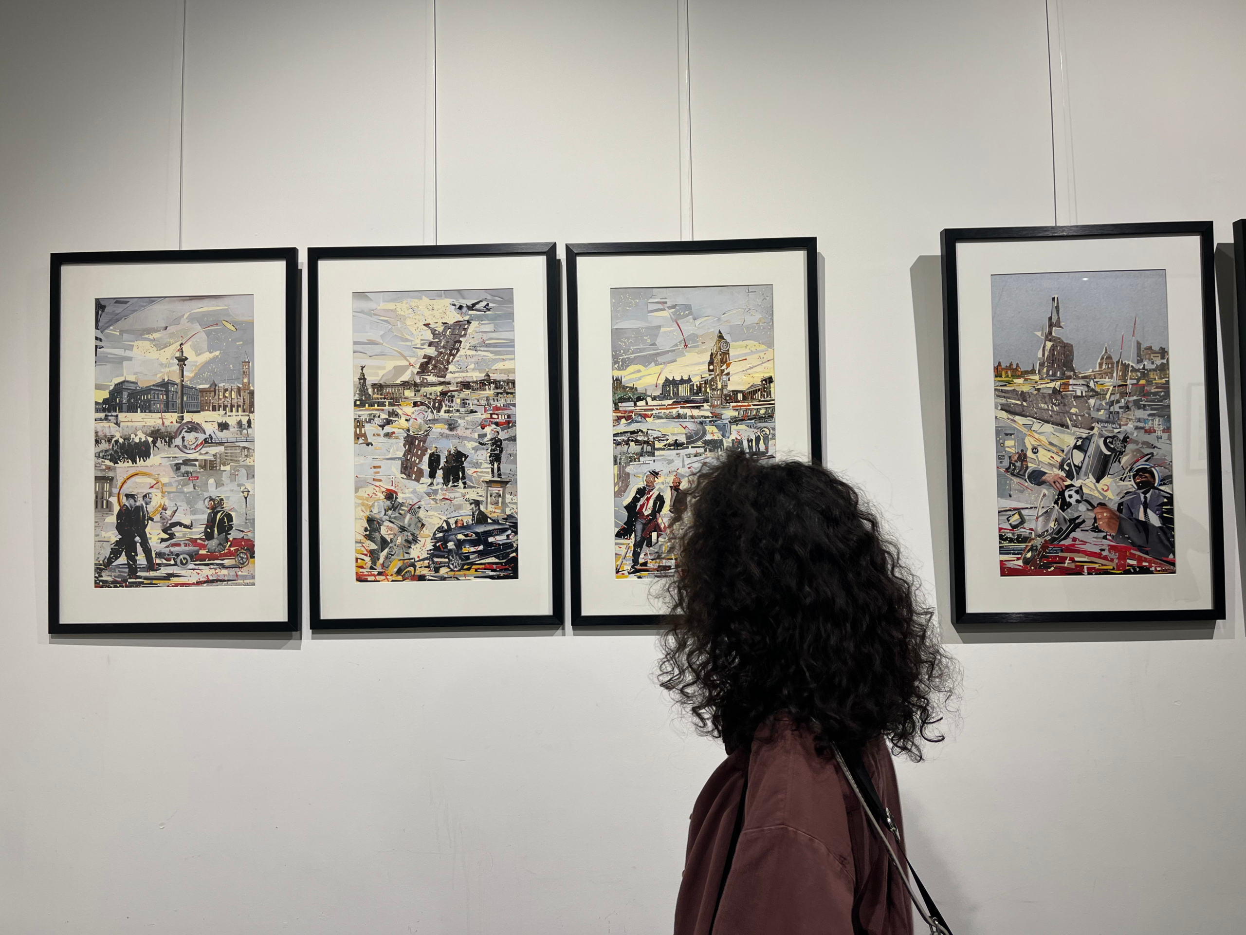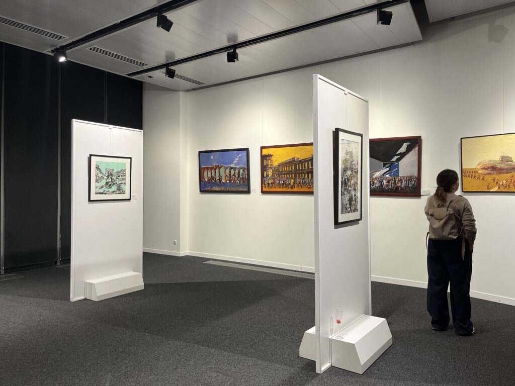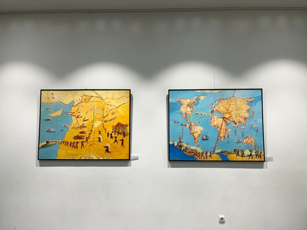 The exhibition presents several series, including “Conflicts,” “Citizens” and “In the City.” In “Conflicts,” Romeo paints his personal experience of living alongside war, placing miniature soldiers against large-scale map landscapes. The figures appear small and nearly swallowed by the scale of borders and terrain, mirroring how human lives fade from view within the logic of conflict.