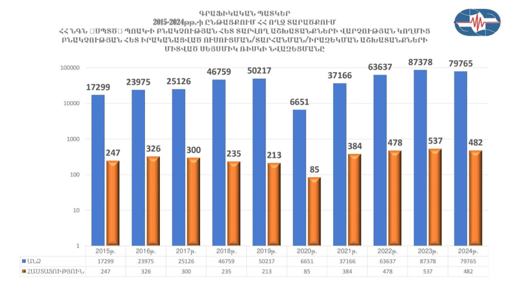 Data from 2015 to 2024 shows the number of individual (blue) and corporate (orange) training sessions and events organized by the Population Outreach Department of the Regional Survey for Seismic Protection in seismic risk mitigation (source: NSSP RA)