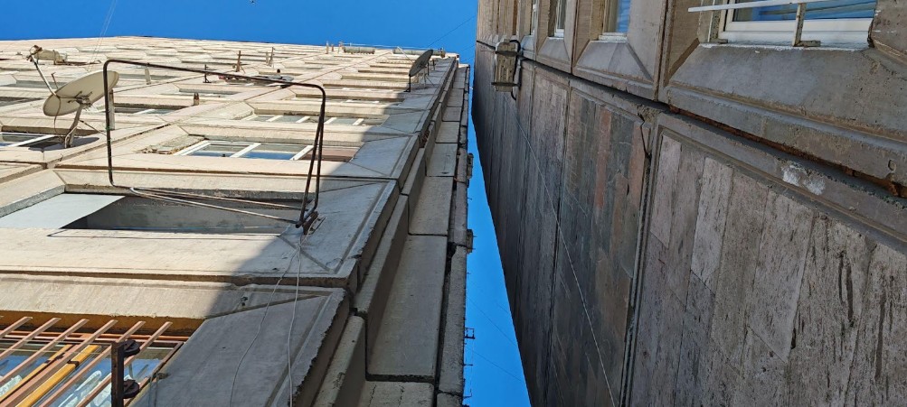 Just outside central Yerevan, two 14-story apartment buildings lean toward each other, their rooftops at 8/2 and 8/3 Artsakh Ave. separated by a mere 35 to 40 centimeters. According to the same report, the last time the buildings were inspected was 2004. The narrow gap, the 2023 Hetq report warned, puts the structures at “level 3” seismic risk — and they haven’t been inspected since 2004.