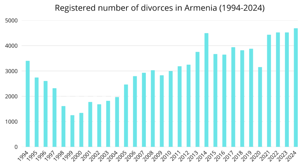 A review of Armstat’s statistical data through  2024, shows a clear upward trend of divorces. In the mid-1990s, divorces were relatively rare with no more than 2,000 divorces per year   between 1998-2004. By 2024, that number had more than doubled to  e 4,689 registered divorces.