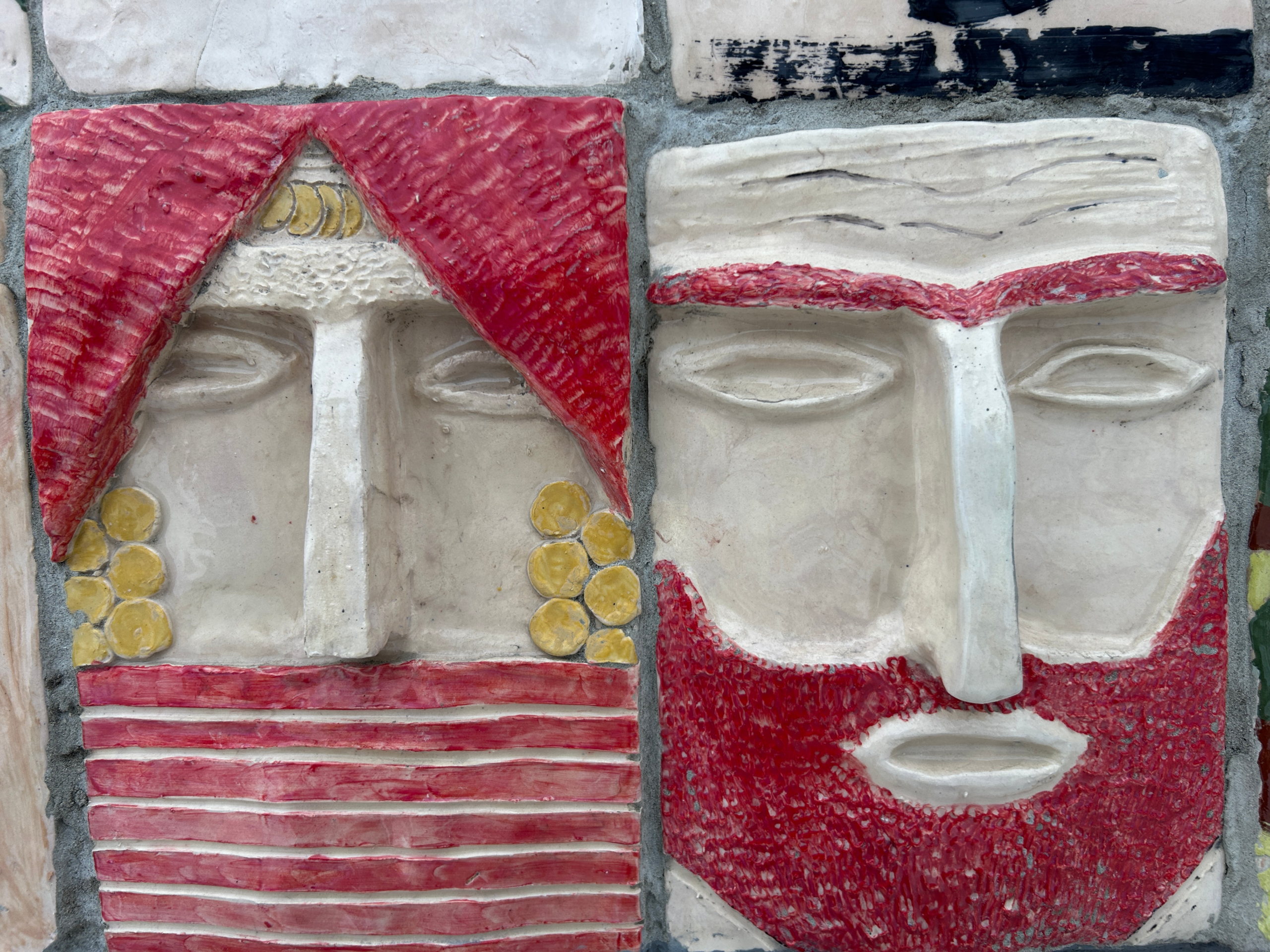 The installation is beside the Park gates, stretching wide along a freshly painted wall. Around 150 ceramic masks are densely packed together, with slight gaps between them, held together with cement.